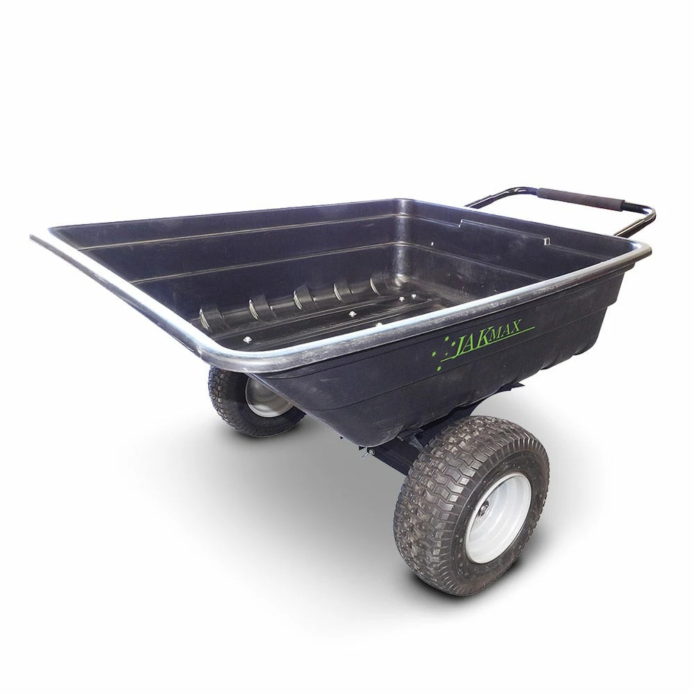 Extra big wheel trailer to tow behind your ride-on mower or UTV. Easily converts to a wheelbarrow by simply securing the jockey wheel with a pin.