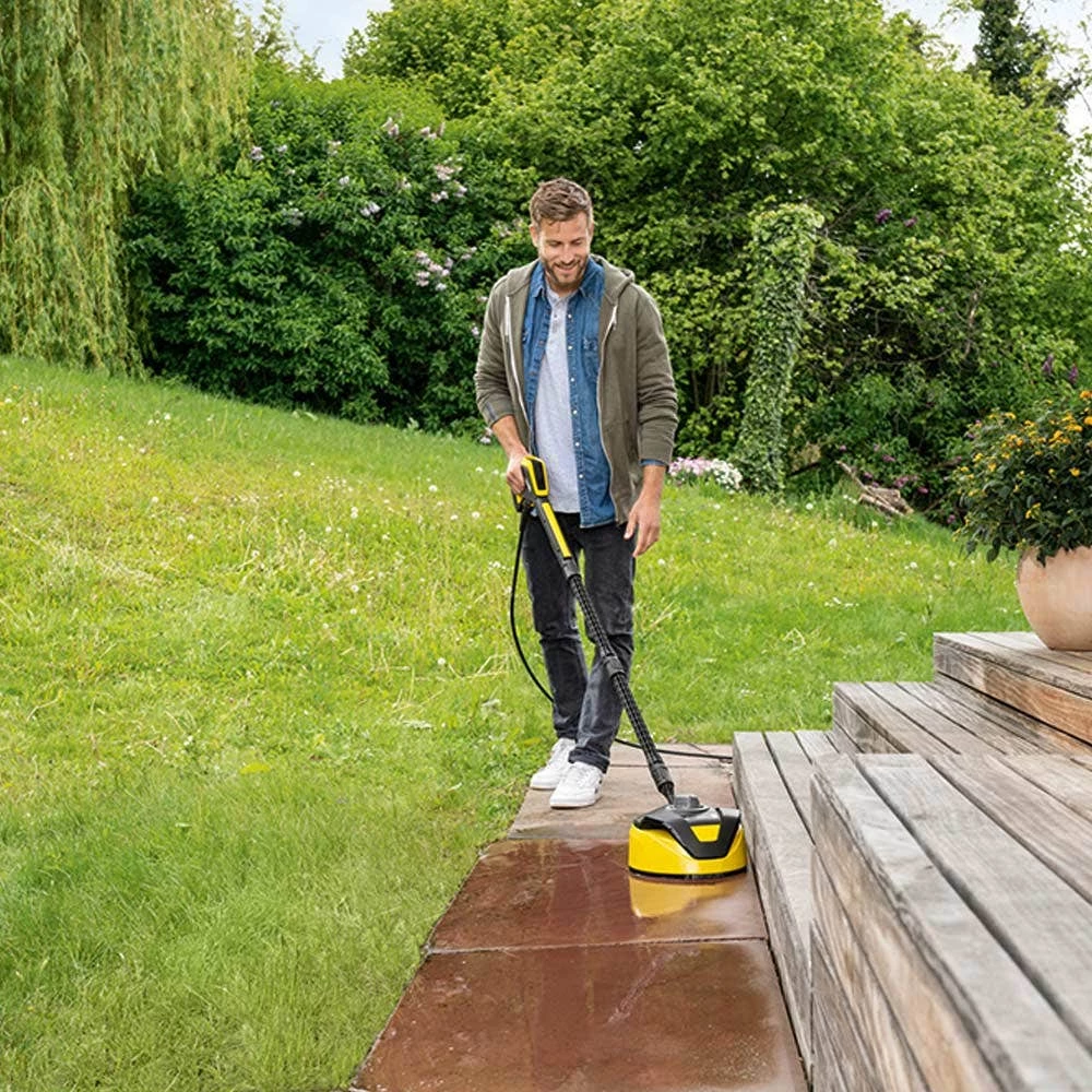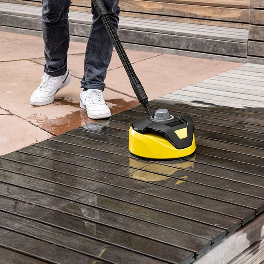 The twin-jet rotating arm of the T 5 T-Racer surface cleaner is capable of removing dirt over large areas, providing fast and efficient cleaning of large outside areas. The surface cleaner can be adjusted so that the nozzle is positioned at the ideal distance from the surface, depending on the material, making it ultra-practical for use. This means that hard surfaces, such as stone and concrete, can be cleaned just as effectively as more delicate surfaces, such as wood. The T 5 T-Racer cleans in around half the time needed by a spray lance. The hood reliably protects the operator and surroundings from spray water, and the “hovercraft effect” makes manoeuvring simpler than ever. Simply remove the extension poles and use the handles for comfortable use when cleaning vertical surfaces such as walls and facades. Suitable for pressure washer ranges K 2 to K 7.