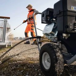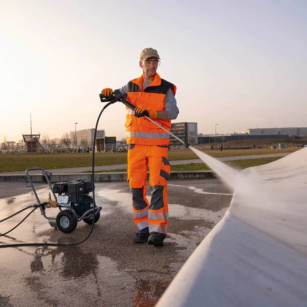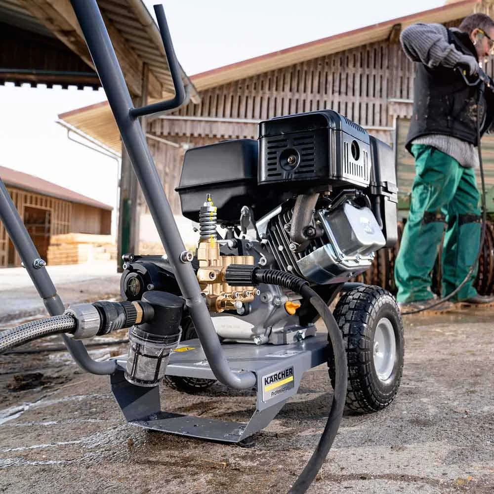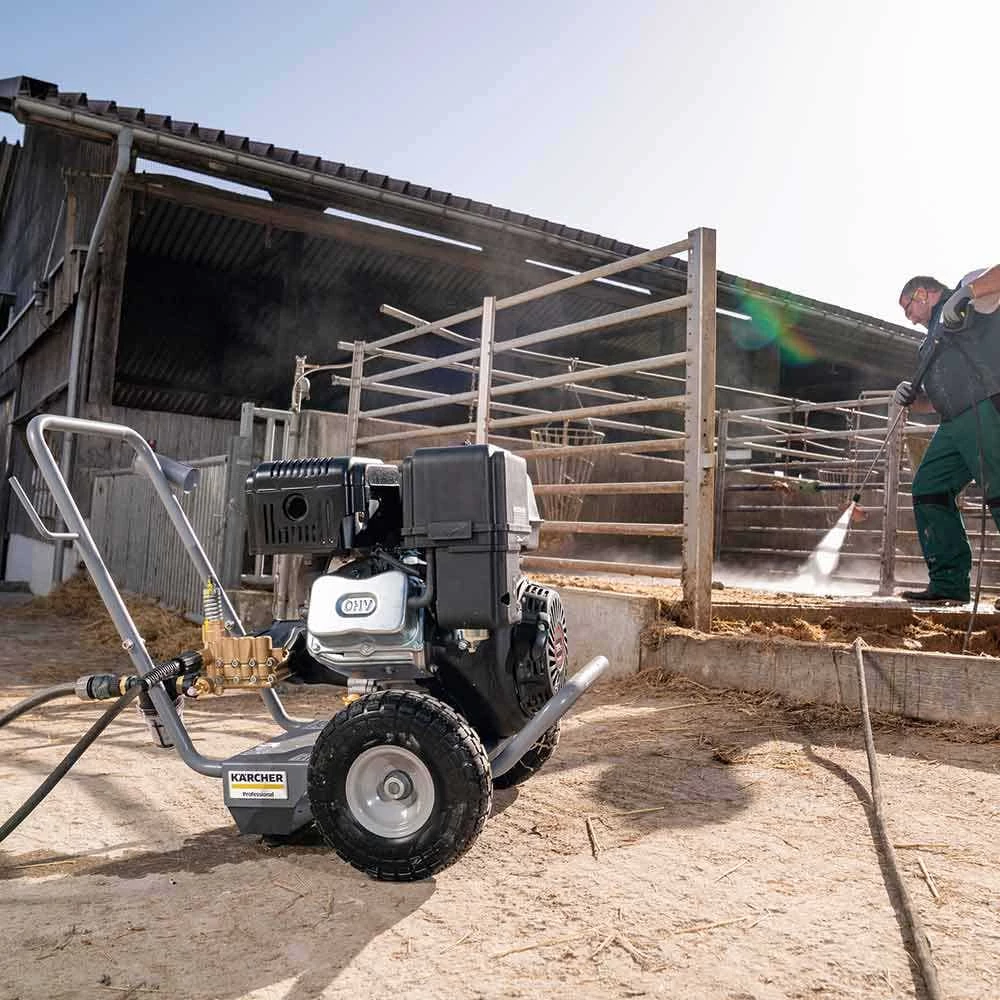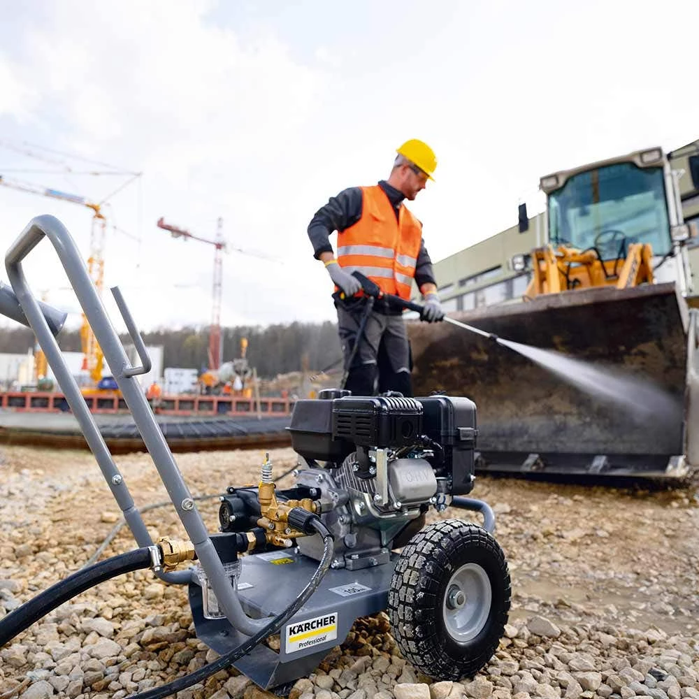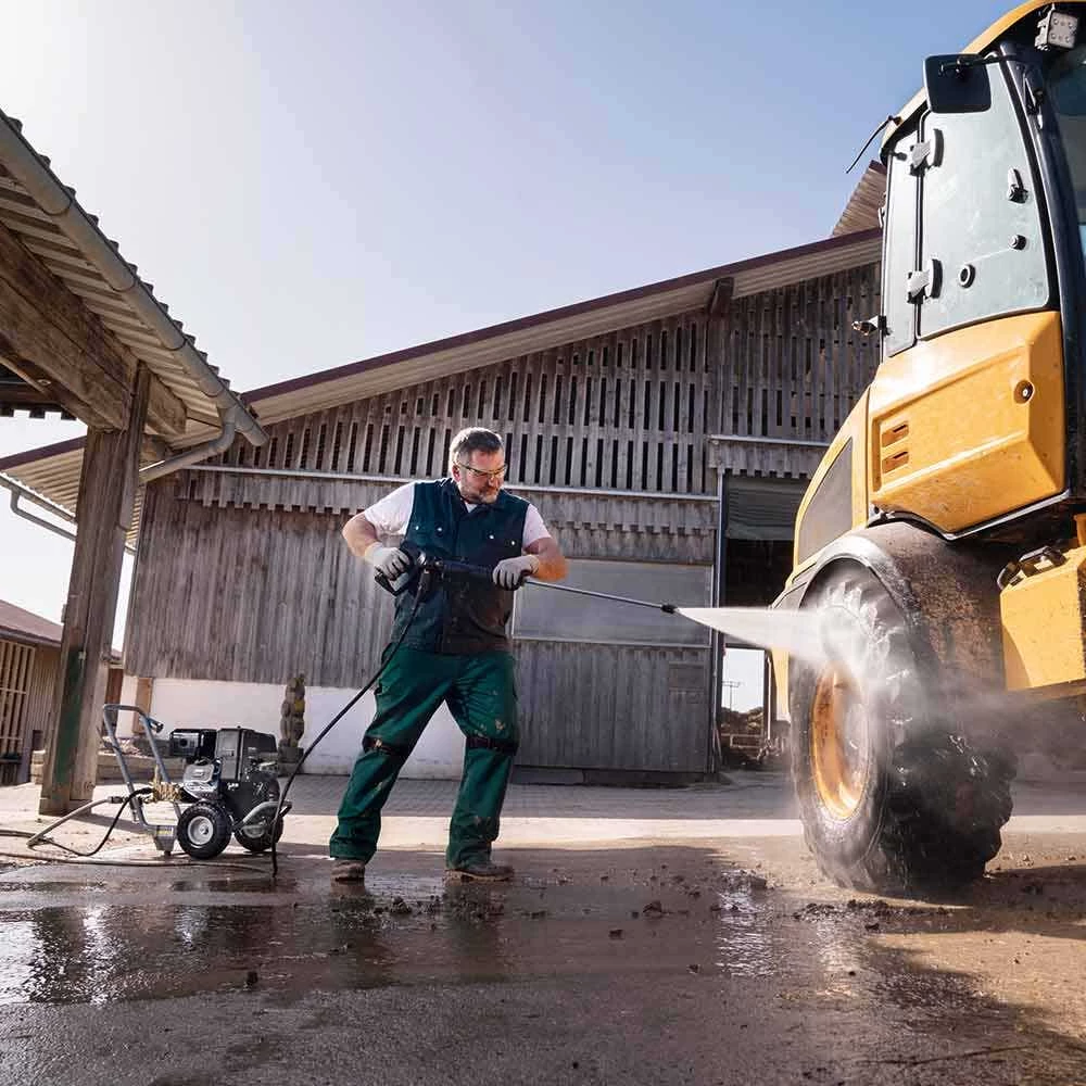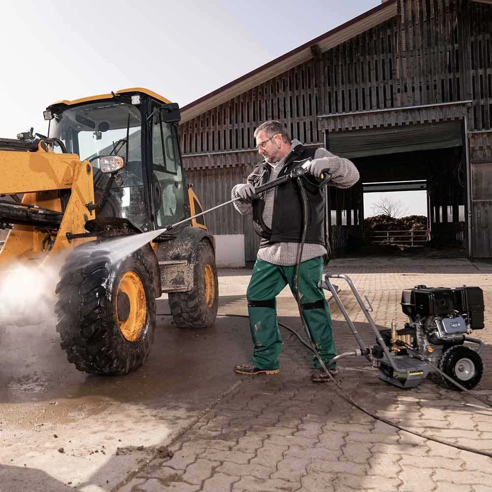 The HD 7/20 G Classic cold water high-pressure cleaner has a powerful petrol engine, making it possible to complete demanding cleaning applications in places without a power supply. The construction industry, municipalities, handicraft and building cleaning benefit in particular from the self-sufficient operational availability of our mobile HD 7/20 G Classic cold water high-pressure cleaner. Its powerful petrol engine (EU STAGE V) makes it possible to complete cleaning tasks even in places without an external power supply; the working pressure of 200 bar, the robust crankshaft pump and a flow rate of up to 700 litres of water per hour produce outstanding results.