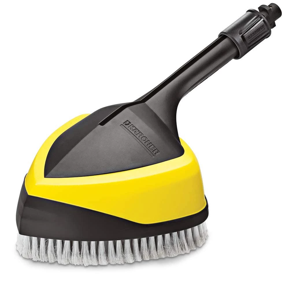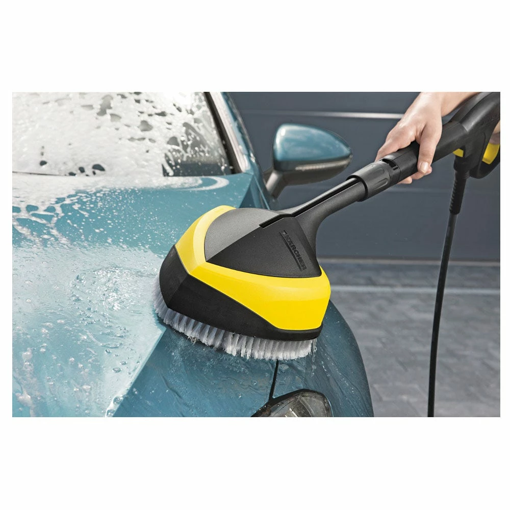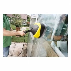 The WB 150 power brush is perfect for splash-free cleaning of sensitive surfaces such as vehicle or motorcycle paintwork, glass, winter gardens, garage doors, shutters, blinds, garden furniture, bicycles etc. The innovative washing brush with two rotating flat jet nozzles combines full power with gentle force. The new surface cleaner with soft washing brush impresses with its efficient combination of a high-pressure jet and manual brush pressure. Working with the power brush results in significant savings of energy and water – as well as a time saving of up to 30%. The fast, efficient and effortless cleaning using high pressure in conjunction with a brush ensures even cleaner homes and gardens. Suitable for all Kärcher pressure washers of the K 2 to K 7 classes.