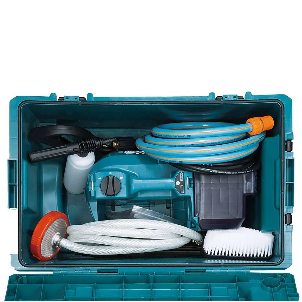 The DHW080 is powered by two 18V Li-ion batteries (not included) so you get 36V. The self-priming function means not only can it be connected to a main water source but the storage box can also be filled and used as the water source, meaning a completely cord/hose-free pressure washer. It also features two modes allowing you to choose the correct pressure for the job and the adjustable pressure function on the gun provides an even greater level of control. The DHW080 comes with several attachments as standard, adding to its versatility.