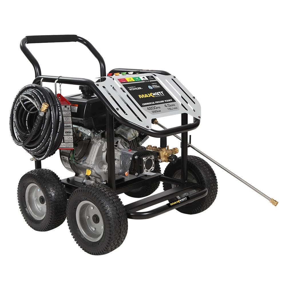 The Maxwatt pressure washer have been manufactured using only high-quality components and designed to last in the toughest conditions. These high-quality components include a specifically designed powerful 14HP KOHLER engine which drives the Italian Annovi Reverberi pump delivering high power output, providing real cleaning power which makes it ideal for those who enjoy the satisfaction of knocking over projects with no fuss. With the MXPW4200 Pressure washer you’ll make light work of sizeable jobs such as blasting paths and driveways clean, roof restoration, cleaning vehicles, boats and your other toys. Five different quick release nozzles are included which are comprehensively tested to endure intensive spray pressure for years, you will be able to tackle anything from light cleaning to the hard to do tough jobs. The steel frame, and puncture proof wheels make this pressure washer perfect for commercial use where an electric model just isn’t powerful enough. Backed with a two-year warranty the Maxwatt pressure washer is designed and manufactured to provide you with peace of mind and the power when you need it!